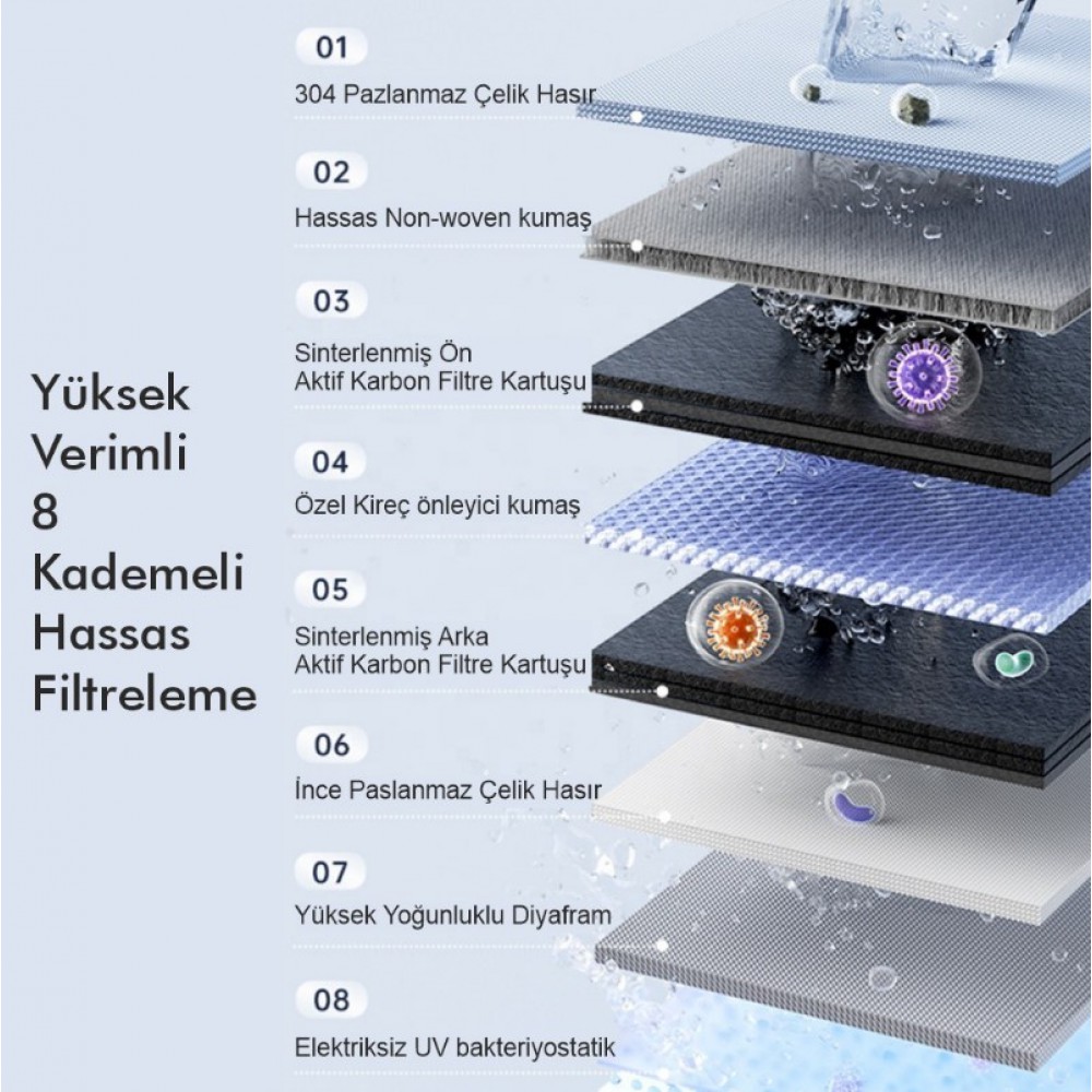 filtresi % 99 oranında sterilizasyon sağlar. Yeni nesil filtre, kireçlenmeyi önler, bakterileri ve kloru sudan temizler.